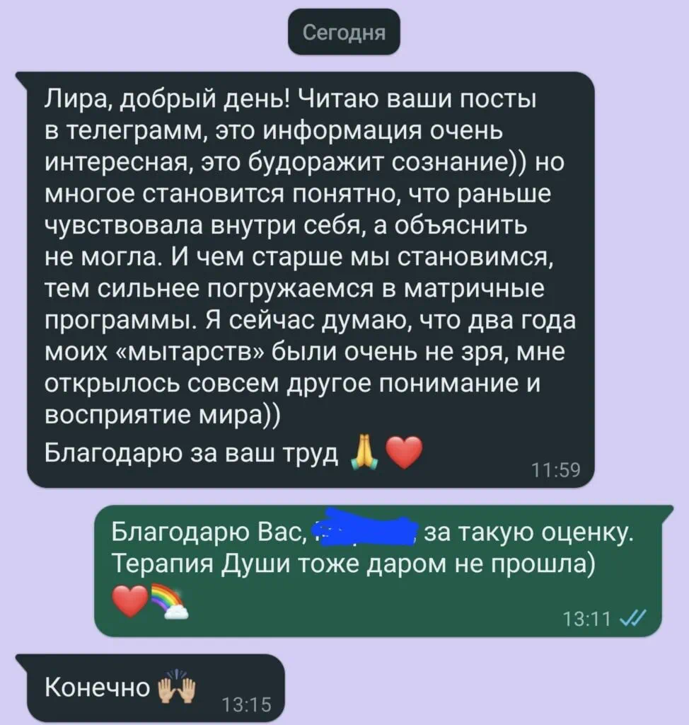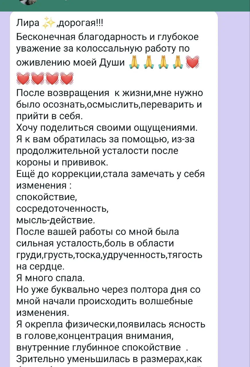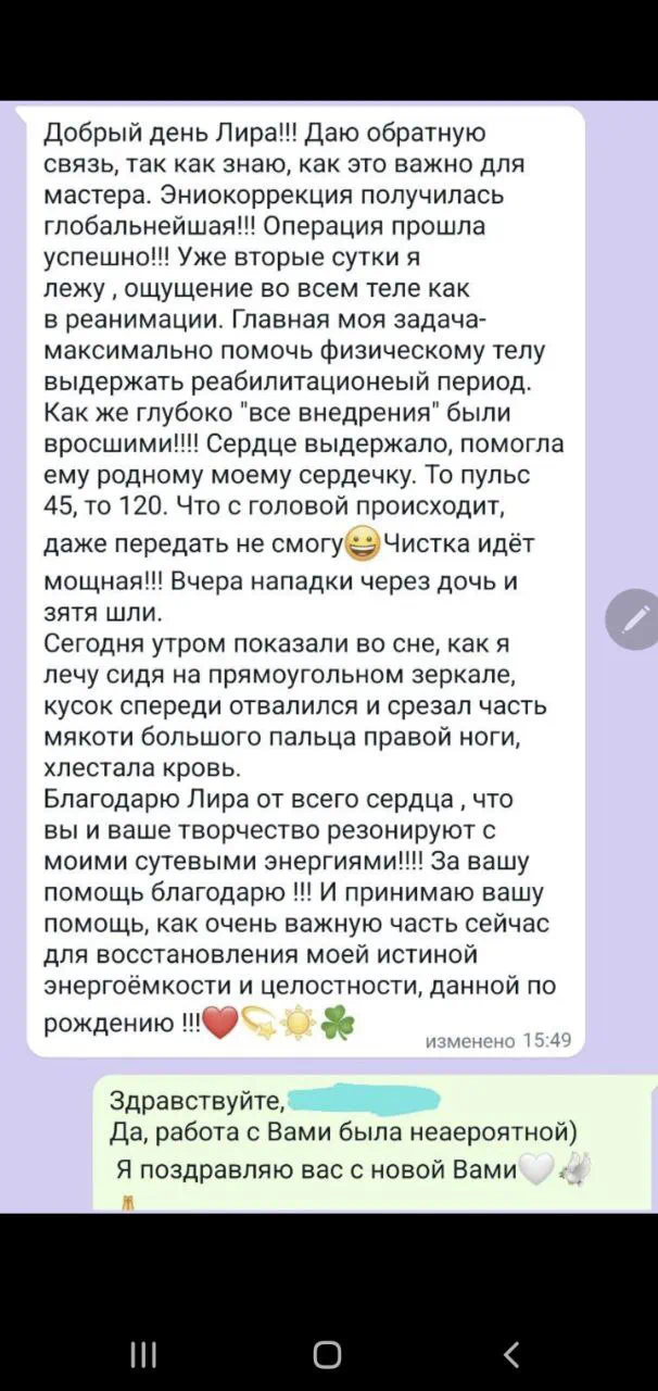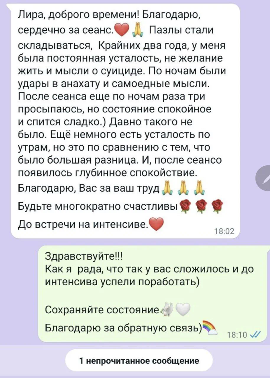 Можно провести аналогию с хирургией. Мои действия это бесконтактное операционное вмешательство на матричном уровне. В основном направленная на перезапись деструктивных программ и восстановление исходного, здорового состояния психофизиологической и родовой систем.