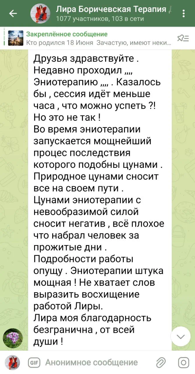 Существует настоящая интерпретация «прошлых» событий, которая формирует наше сегодняшнее состояние. Я работаю с глубинными памятными следами в энергоинформационной структуре человека, изменяя их эмоциональный заряд и смысловую нагрузку, что кардинально меняет их влияние на «настоящее».
